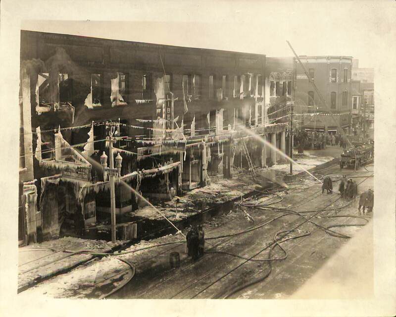 Photograph of the fire which destroyed the Century Block and Pierce Block buildings. March 3, 1928