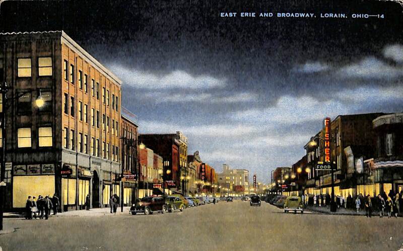 The illustration is of a busy evening scene in downtown Lorain. People are shown walking on both streets, and numerous cars can be seen parked at the curbs and also traveling up and down Broadway. The streetlights are visible.